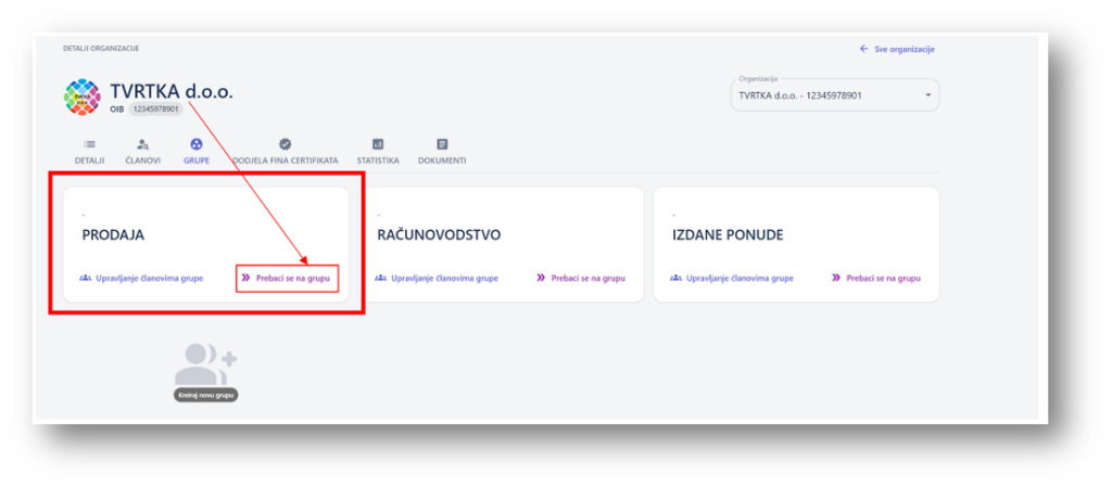 Unutar Organizacije odabirete grupu u kojoj želite raditi i čiji ste član.