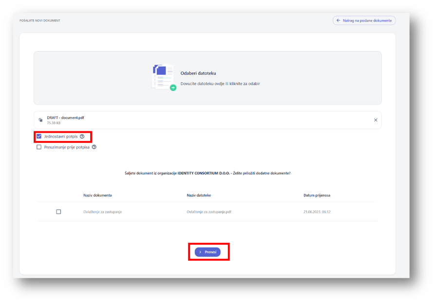 Ukoliko želite da vam osoba s druge strane, potpisnik, učitani PDF dokument poptiše samo sa jednostavnim (SES) e-potpisom, tada odabirete opciju „Jednostavni potpis“.