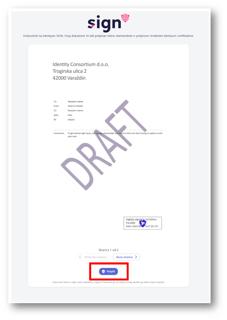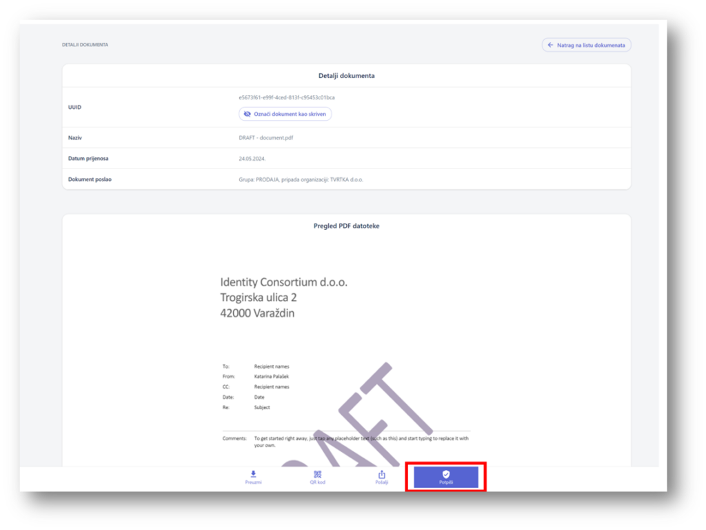 4. Vi kao pošiljatelj dokumenta isti možete odmah potpisati, a možete i kasnije potpisati nakon ostalih potpisnika. Dokument potpisujete klikom na „Potpiši“.
