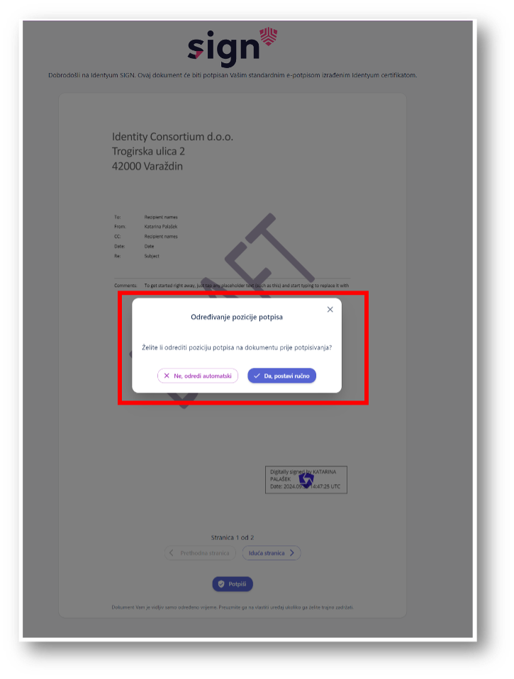 Klikom na „Potpiši“ potpisniku se prikazuje ekran za određivanje pozicije potpisa. Potpisnik određuje da li želi ručno postavljanje potpisa ili će se potpis automatski pozicionirati na posljednju zasebnu stranicu dokumenta.
