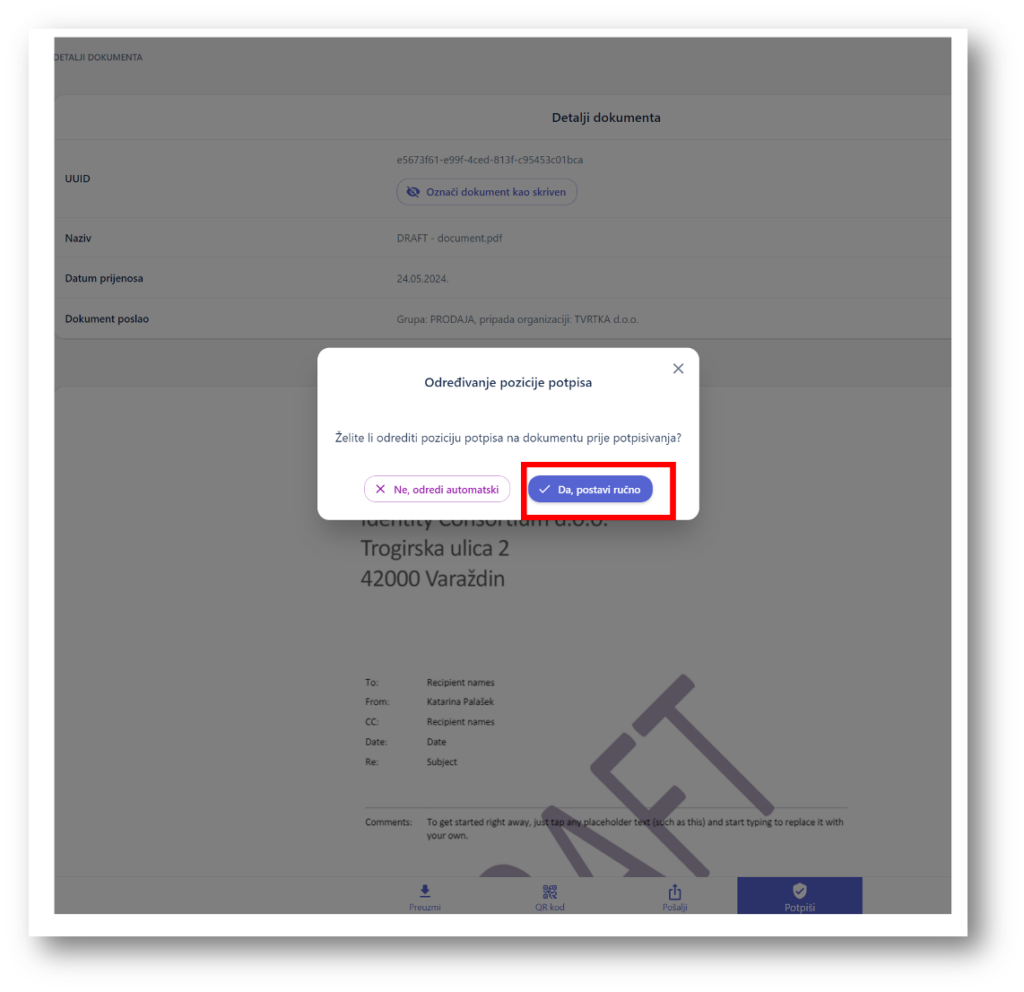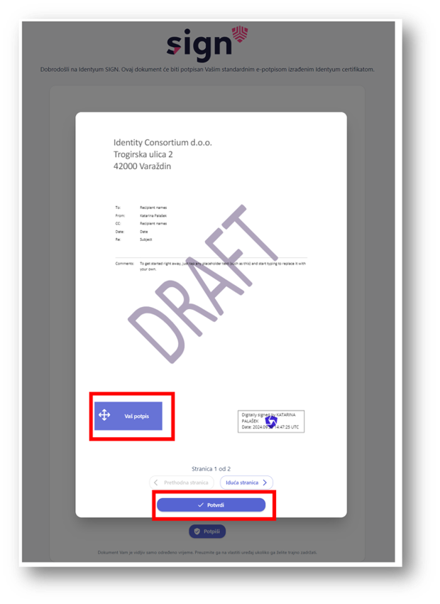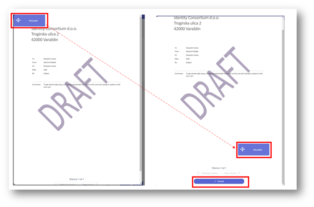 Ukoliko želite ručno pozicionirati potpis tada mišem povcite „Vaš potpis“ na željenu poziciju na dokumentu i „Potvrdite“ odabranu poziciju.