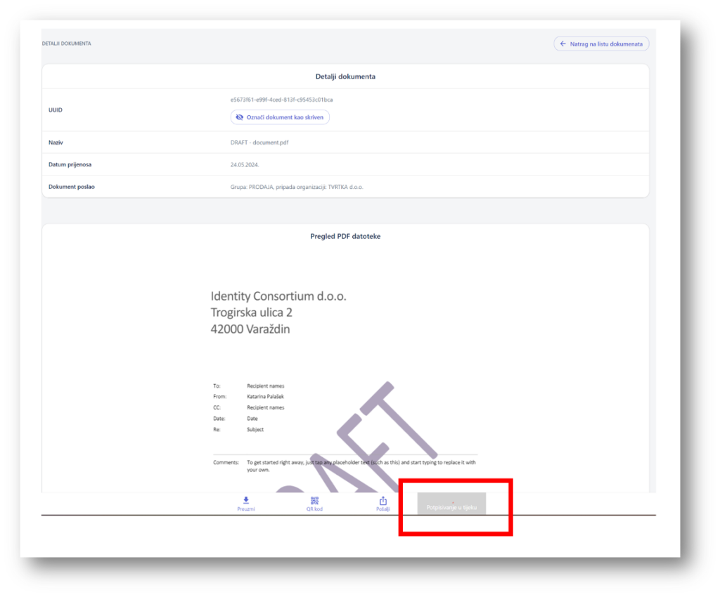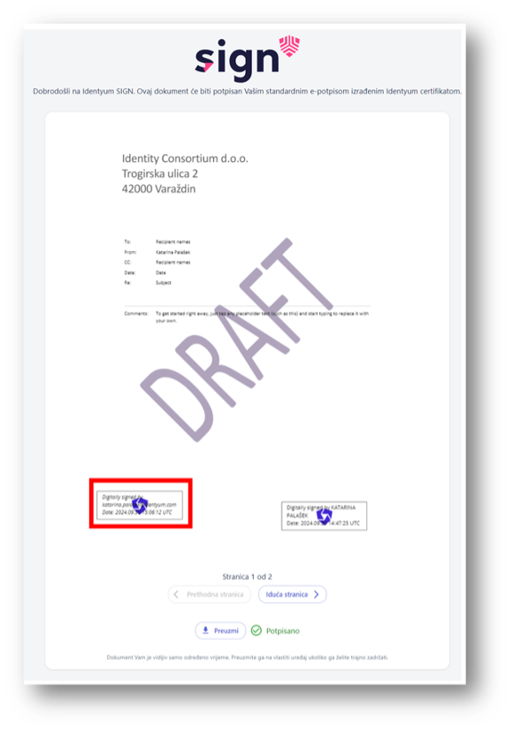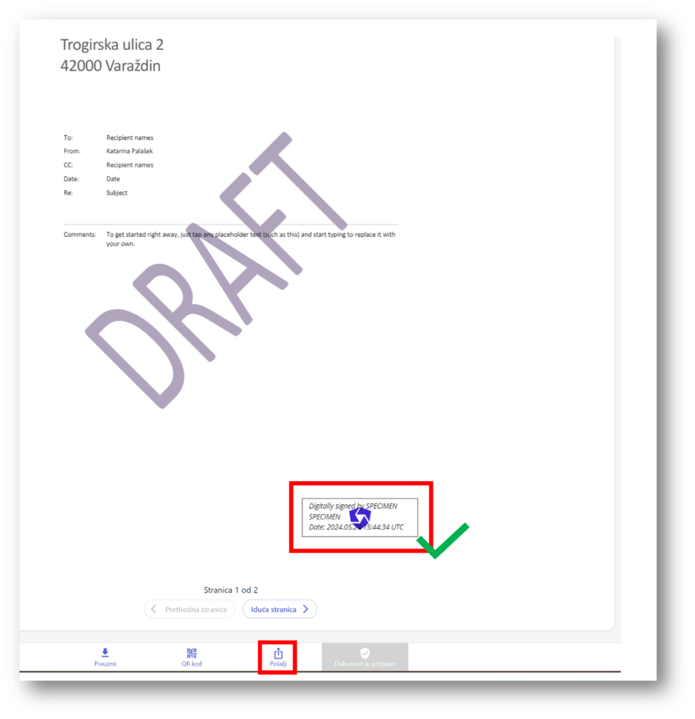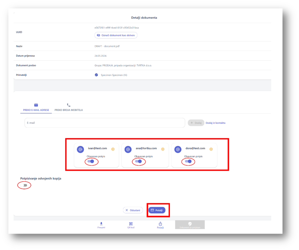 Klikom na „Pošalji“ potpisnicima se šalje PDF dokument na potpis.