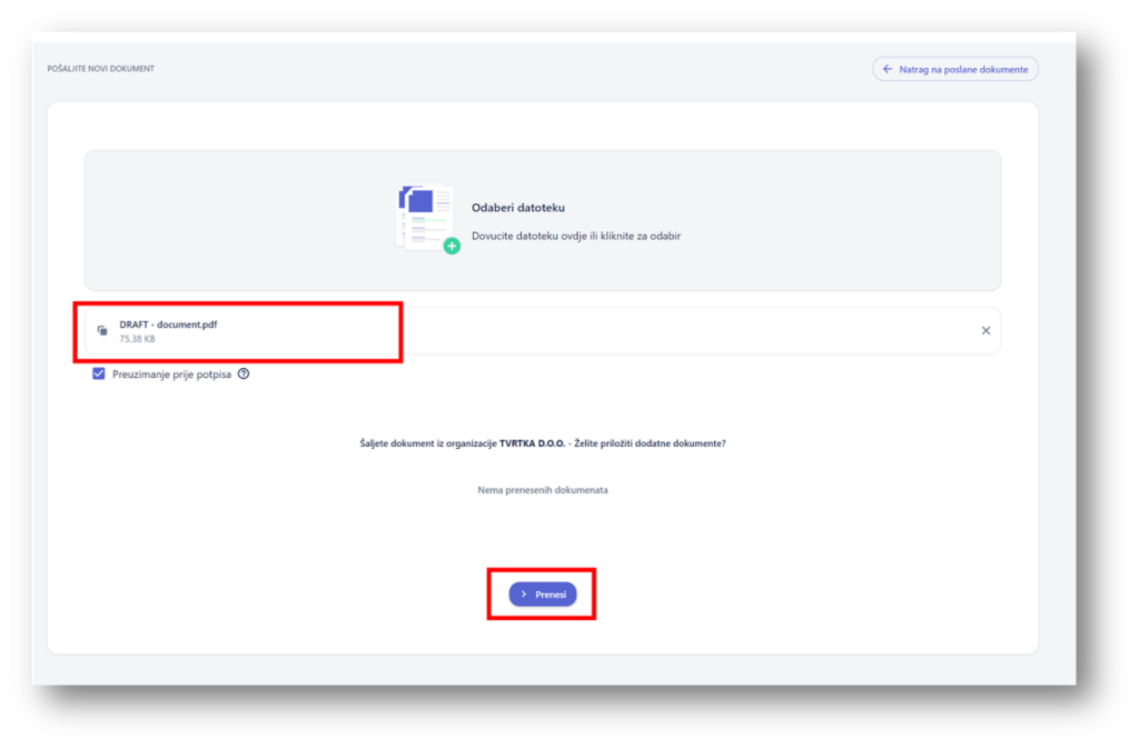 2. Sa svog računala učitajte PDF dokument koji želite poslati na potpis.