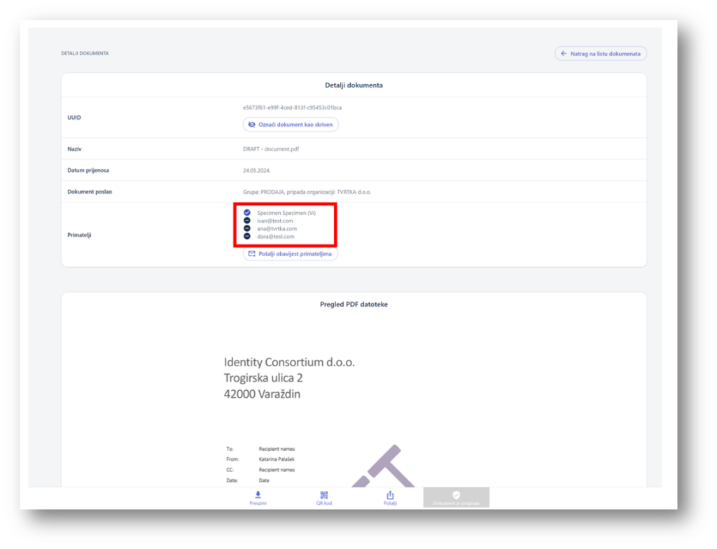 8. Klikom na „Detalji dokumenta“ vidite sve primatelje/potpisnike dokumenta, kao i informaciju da li su dokument potpisali.