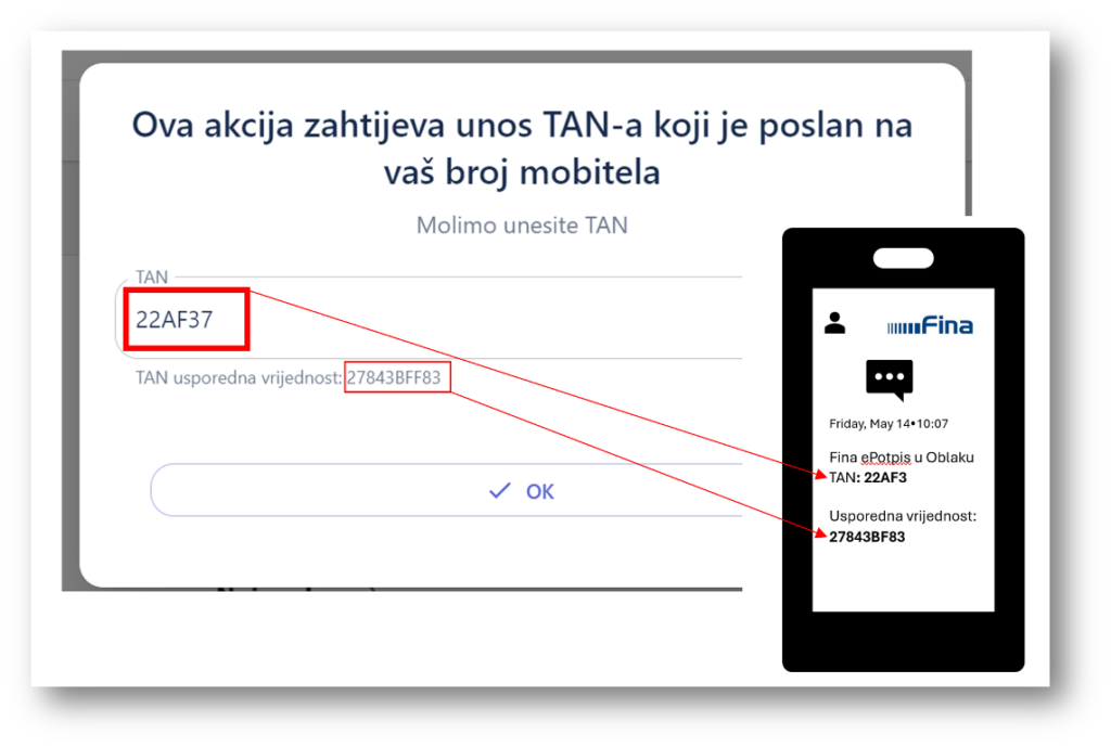 Proces učitavanja, slanja dokumentacije jednak je kao i proces potpisivanja s naprednim (AdES) e-potpisom korištenjem Identyum certifikata (od 1 do 10) osim dodatnog koraka slanja TAN broja od strane FINA-e na vaš mobitel, a koji se potom prepisuje u za to predviđeno polje.